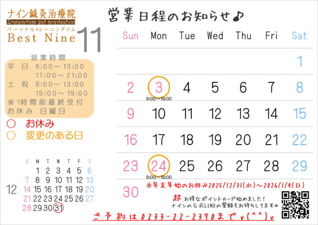 11/3(月)祝・11/24(月)祝は9:00~19:00までの営業日程となります。