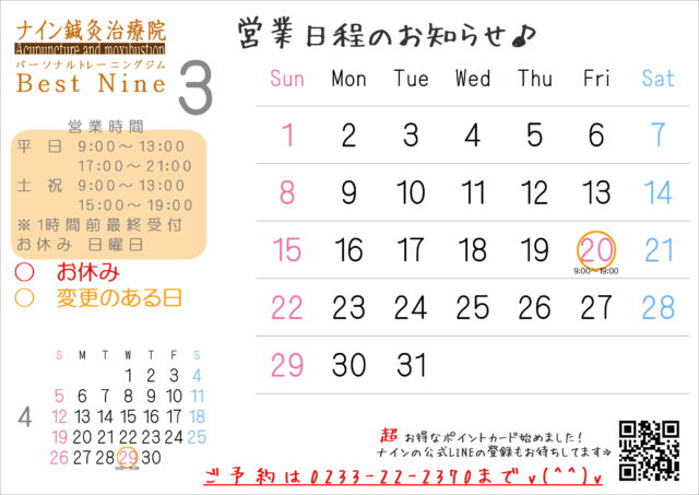 3/20(金)は9:00~19:00までの短縮営業となります。
